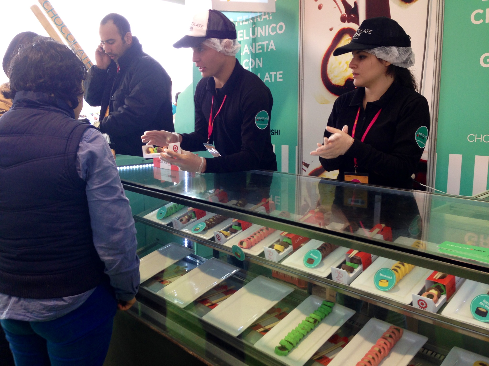 Ya se nos acababa la hora de almuerzo y los tickets así que buscamos comprar lo que sea. Unas jeringas de chocolate de Sugarlab buenazas, turrones de Don Freddy, chocolates, king kong. Ya estaba el taxi afuera cuando veo los makis de Chocolate Sushi. Me quedaba sólo un sol pero igual pregunté: